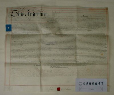 | Parchment : 1 sheet 58cm x 69cm with wax seal and revenue stamp. Note that this appears to be a 'standard' manuscript contract which has mostly been written by one person, but with blanks and the property description filled in by another. | |||||||||||