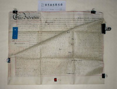 | Parchment : 2 sheets 54cm x 70cm with 1 wax seal, revenue stamps and plan of the property. | ||||||||||||