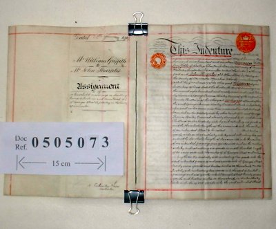 | Parchment : 4 sheets 29cm x 22 cm with 2 wax seals and revenue stamps. | |||||||||||