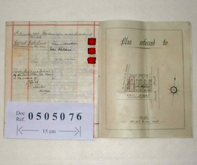 | Parchment : 10 sheets, 28cm x 23cm with 3 wax seals, revenue stamps and a plan of the property. | ||||||||||||