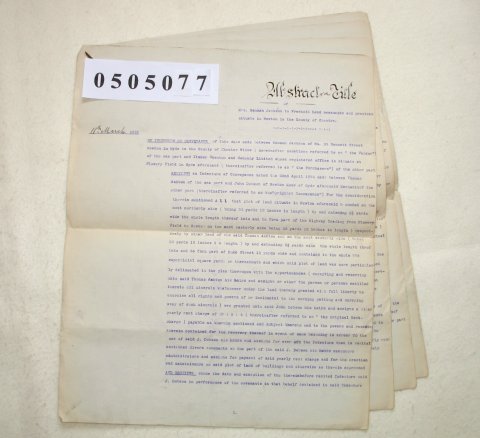 Hannah JACKSON of 55 Bennett Street, Newton in Hyde, Cheshire. Widow. Tinker, Shenton & Co Ltd of Hyde, Cheshire. John DOBSON (deceased) of Newton Moor, Hyde, Cheshire. Mechanic. SUBJECT The document is titled "Abstract of Title of Mrs Hannah Jackson to Freehold Land, messuages and premises situate in Newton in the County of Chester". It recites that John Dobson bought a plot of land in 1874 of 776 square yards on the highway leading from Flowery Lane to Newton. He later erected several houses on this plot. John Dobson died in 1885 leaving everything to his wife, Hannah, who was his sole Executrix. Hannah Dobson later married Robert Hadfield Hall Jackson in 1891, but he died in 1909. In 1921 Hannah Jackson sold number 65 Bennett Street, Newton, which was part of the above ploit, to Tinkler Shenton & Co, Ltd. | ||||||||||||||