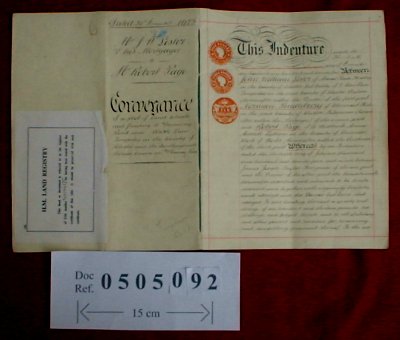 | Paper : 8 sheets 27cm x 21cm with revenue stamps and full page plan of the property | ||||||||||||