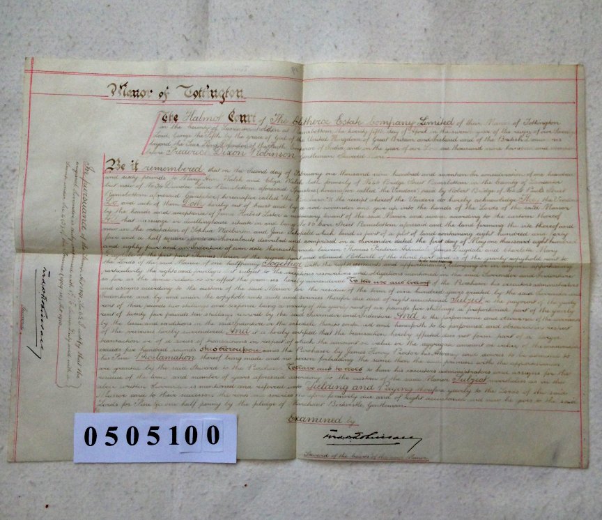 Frederick Dixon ROBINSON of Tottington, Lancashire. Gentleman. Mary Ann WALSH formerly of 46 Bridge Street, Ramsbottom, Lancashire now of 35 Dundee Lane, Ramsbottom, Lancashire. Spinster. Eliza WALSH formerly of 46 Bridge Street, Ramsbottom, Lancashire now of 35 Dundee Lane, Ramsbottom, Lancashire. Spinster. Robert BRIDGE of 4 St Pauls Street, Ramsbottom, Lancashire. Caretaker. SUBJECT The 2 Misses Walsh are selling copyhold property in Ramsbottom to Robert Bridge for £160. Accordingly, Mary and Eliza Walsh are surrendering the property to the Manor and Robert Bridge is being admitted to the Manor on payment of a fine of a 1/2d. The property is a dwelling house at number 86 Carr Street, Ramsbottom. The 'Lord of the Manor' is the Clitheroe Estate Company Limited. | |||||||||||