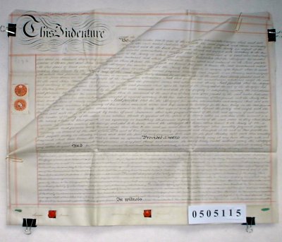 | Parchment : 3 sheets 2 wax seals and signatures. Revenue stamps. | |||||||||||