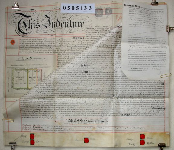 | Parchment : 2 sheets 71cm x 61cm with 5 wax seals, 5 signatures, revenue stamps and plan of the property. Also a separate paper sheet attached. | ||||||||||||
