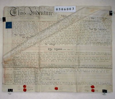 | Parchment : 3 sheets 70cm x 60cm with 5 wax seals, signatures and revenue stamps. Includes Schedule on third sheet. | ||||||||||||