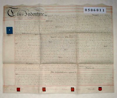 | Parchment : 1 sheet 59cm x 71cm, with 4 red wax seals and signatures, revenue stamp. | |||||||||||