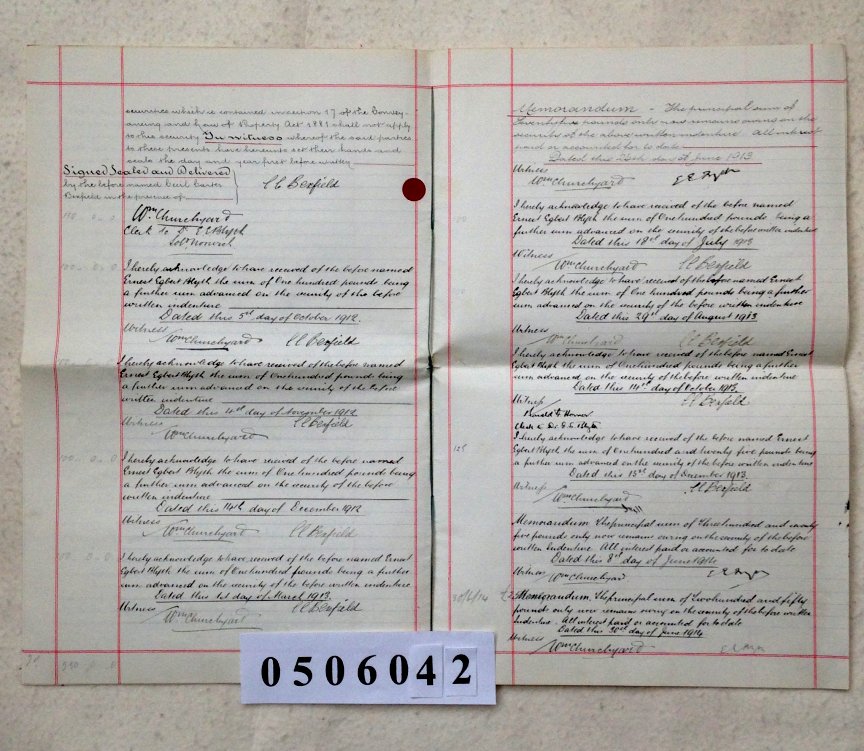 Cecil Carter BEXFIELD of Eagle Street, Norwich, Norfolk - Builder Ernest Egbert BLYTH of Norwich, Norfolk - Gentleman and Doctor of Laws SUBJECT Cecil Bexfield is mortgaging property fronting onto Salisbury Road, Thorpe Hamlet, Norwich, to Ernest Blyth for £150. It has a total area of 1,300 square yards. We are told that Cecil Bexfeld only bought the property the same day as this indenture. There are various memoranda added at the end of the document recording various additional loans and repayments made against the same security. The final entry is in June 1914 when the amount outstanding was £250/-/-d. | |||||||||||