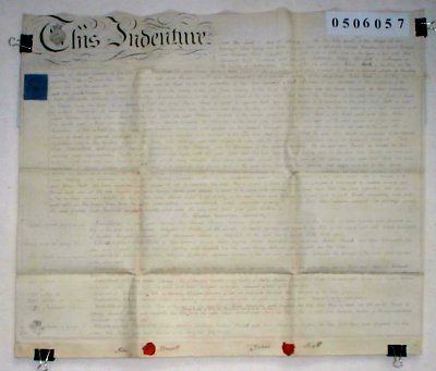 | Parchment : 1 sheet 68cm x 60cm with 2 wax seals, signatures and revenue stamps. | |||||||||||