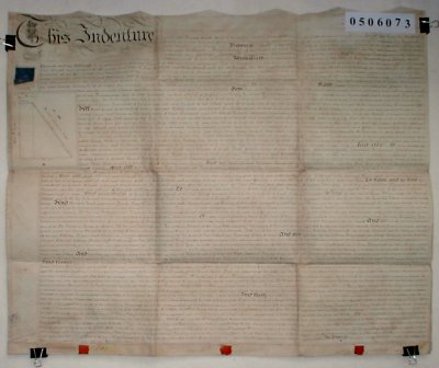 | Parchment : 1 sheet 74cm x 87cm (one of the largest indentures we have) 3 red wax seals and signatures, with Revenue stamp and plan of the property drawn in the margin. | |||||||||||||