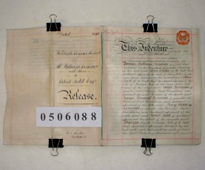 | Parchment : 6 sheets 22cm x 27cm with 7 wax seals and revenue stamps. (Note that the date has been left blank on this document, but the signatures and stamps seem to imply a completed contract.) | ||||||||||||
