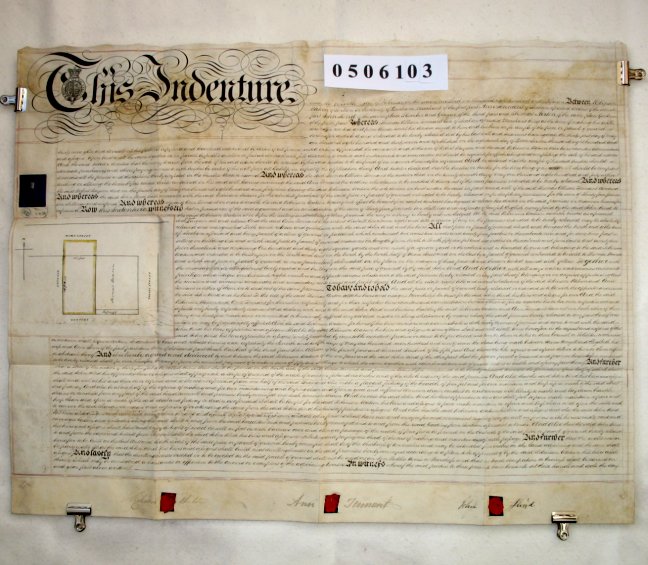 | Parchment : 1 sheet, 58cm x 75cm with 3 wax seals, revenue stamp and small plan of property. | |||||||||||