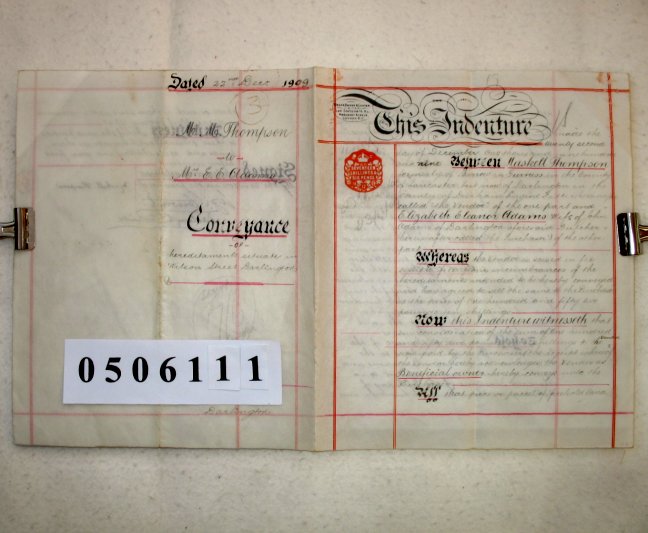 Maskell THOMPSON formerly of Barrow in Furness, Lancashire, and now of Darlington, Durham. Engine Fitter. Elizabeth Eleanor ADAMS, wife of John ADAMS of Darlington, County Durham. Butcher. SUBJECT Maskell Thompson is selling property in Darlington to Elizabeth Adams for £152/10/-d. The property is a dwelling house at number 53 Wilson Street, Darlington, on a plot measuring 14ft x 52ft. | ||||||||||||