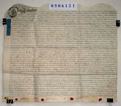 | Parchment : 53cm x 61cm 1 sheet with 4 wax seals, 3 signatures and duty stamp. | |||||||||||