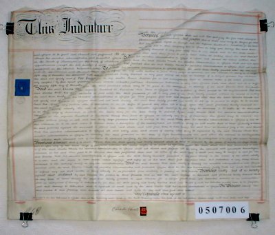 | Parchment : 2 sheets 68cm x 55cm with wax seal and signature, and revenue stamps. | ||||||||||||