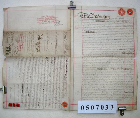 | Parchment : 2 sheets 40cm x 26cm with 5 wax seals, 5 signatures and revenue stamps. A second Indenture of 1906 has been added on the back. | |||||||||||