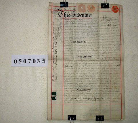 | Parchment : 2 sheets 48cm x 31cm with 3 wax seals, 3 signatures and revenue stamps. A second Indenture of 1892 has been added on the third side. | |||||||||||