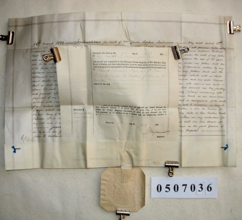 | Parchment : 1 sheet 52cm x 34cm together with grant of probate 34cm x 26cm and pendant seal | ||||||||||||