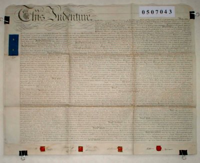 | Parchment : 1 sheet 64cm x 78cm with 4 wax seals and revenue stamps. | ||||||||||||