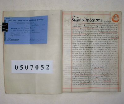 James Newall of Leek, Staffordshire. Solicitor's Clerk. The Leek and Moorlands Building Society. SUBJECT James Newall is borrowing £200 from the Leek and Moorlands Building Society on a mortgage on a newly erected dwelling house in Westwood Road, Leek, Staffordshire. A paper receipt is attached for the repayment of £185/4/11d to redeem the mortgage in 1890. | ||||||||||||