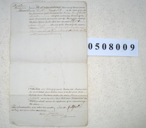 This is a record made "out of court" of the affairs of the Manor of Birdham Broomer, Sussex. In it, Ann Cutfield is surrendering copyhold land held by her in the manor "to the uses of her Will" (which means that she will be able to pass on the property as directed in her Will). No details of the property are given, but the document does include the signature of Ann Cutfield. | ||||||||||||||