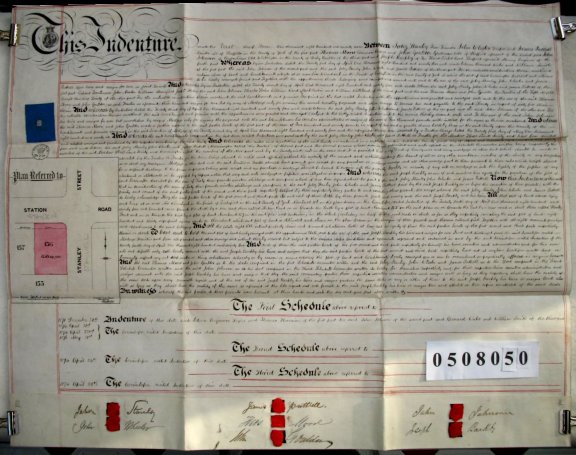 | Parchment : 1 sheet 73cm x 59cm with 7 wax seals, signatures, and revenue stamps. Includes schedules at bottom of sheet.