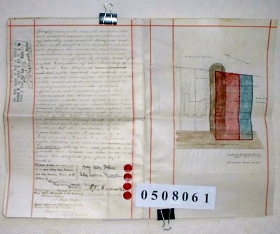 | Parchment : 4 sheets written on all sides 25cm x 38cm signed, sealed and stamped with a plan of the property on the back page. | ||||||||||||