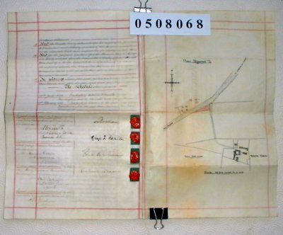 | Parchment : 3 sheets 25cm x 39cm with 4 wax seals and signatures with Revenue stamps. Scale plan on back page. Schedule. | |||||||||||