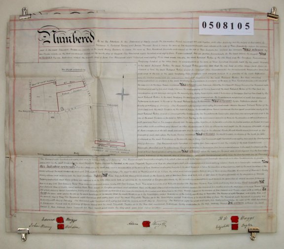 | Parchment : 2 sheets 57cm x 72cm with 5 wax seals, 5 signatures and plan of the property | ||||||||||||