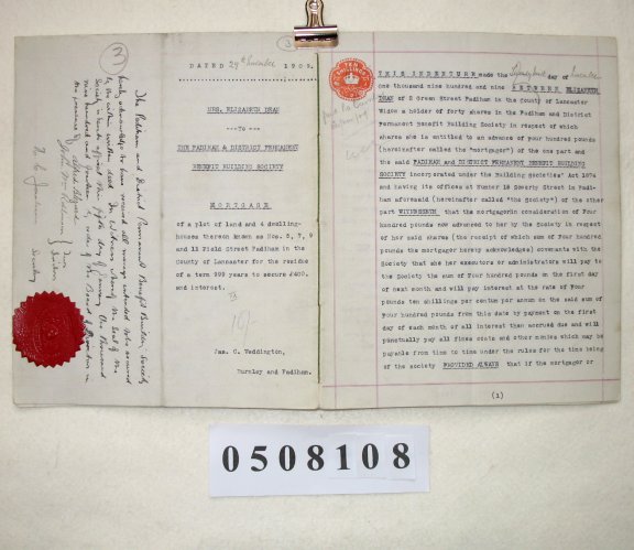 Elizabeth DEAN of 2 Green Street, Padiham, Lancashire. Widow. The Padiham & District Permanent Benefit Building Society SUBJECT Elizabeth Dean is mortgaging property in Padiham, Lancashire, to the Padiham Building Society for £400. It consists of 4 houses, at numbers 5, 7, 9 and 11 Field Street, on which she holds a 999 year lease. A memorandum added on the back records that the mortgage had been repaid by January 1914. | ||||||||||||