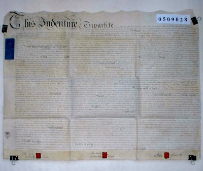 | Parchment : 1 sheet 64cm x 83cm with 3 wax seals all signed or with marks, and revenue stamps | |||||||||||||||