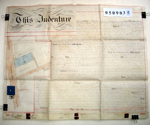 | Parchment : 1 sheet 59cm x 72cm with 5 wax seals, 4 signatures, revenue stamp and a large plan of the property. | |||||||||||