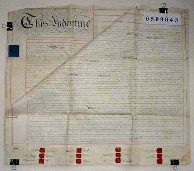 | Parchment : 2 sheets 61cm x 70cm with 12 wax seals and revenue stamps. | |||||||||||||