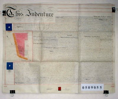 | Parchment : 1 sheet 59cm x 73cm with 1 wax seal, revenue stamp and plan of the property. | |||||||||||||