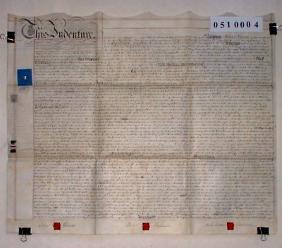 | Parchment : 1 sheet 64cm x 76cm with 5 wax seals, signatures and revenue stamps. A second indenture of 1891 has been added on the back. | |||||||||||
