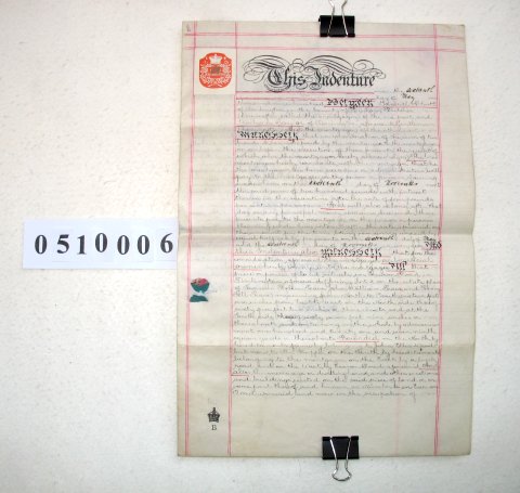 | Parchment :2 sheets 40cm x 26cm with 1 wax seal, 1 signature and revenue stamp. A second Indenture of 1905 has been added on the back. | |||||||||||