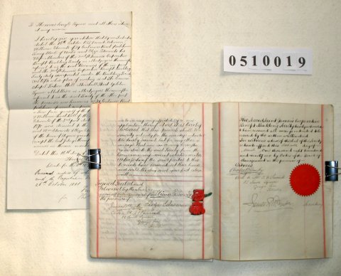 | Parchment : 6 sheets closely written 25cm x 20cm and cover with 2 red wax seals, 2 signatures and revenue stamps. Includes a separate paper letter 33cm x 21cm | ||||||||||||||