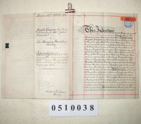 Joseph GREGSON of Bowlalley Lane, Kingston upon Hull. Chartered Accountant. John EMERSON of Twyer's House, Hedon Road, Hedon, Yorkshire. Estate and Financial Agent. The Burnley Building Society. SUBJECT We are told that John Emerson was adjudged to be bankrupt in 1894 at which time John Gregson was appointed trustee of his estate and effects. It appears that John Emerson had bought a plot of land in 1887 which was then at Newland in the parish of Cottingham, but which has since become part of the City of Kingston upon Hull. It is a plot of 448 feet x 40 feet and lies between Victoria Avenue and Park Avenue. The Burnley Building Society appears to hold a mortgage on this property and Joseph Gregson is now selling it to them for £10/10/-d. | |||||||||||