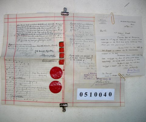 | Parchment : 4 sheets 37cm x 25cm with 6 wax seals, signatures and revenue stamps. A separate paper letter is attached. | |||||||||||