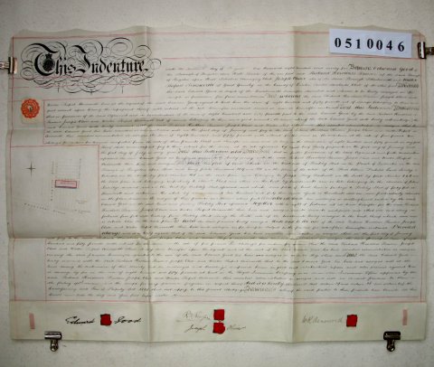 | Parchment : 1 sheet 55cm x 74cm with 4 wax seals, 4 signatures, revenue stamps and plan of the property. | |||||||||||