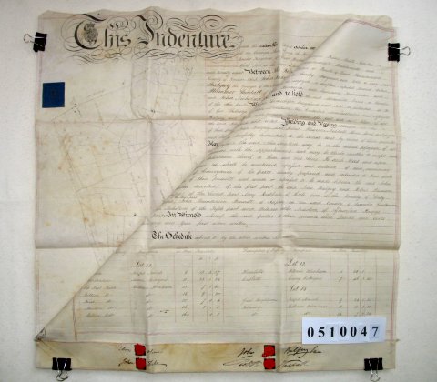 | Parchment : 2 sheets 64cm x 64cm with 4 wax seals, 4 signatures, revenue stamps and a large and detailed plan of the property | |||||||||||