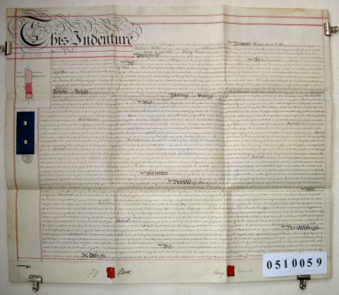 | Parchment : 1 sheet 60cm x 72cm with 2 wax seals, 2 signatures, revenue stamps and small plan of the property | ||||||||||||