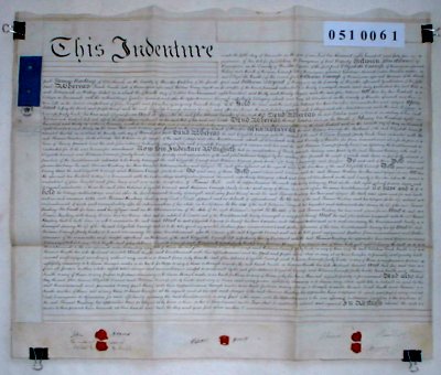 | Parchment : 1 sheet 62cm x 76 cm with 5 wax seals, 5 signatures and revenue stamps. | ||||||||||||