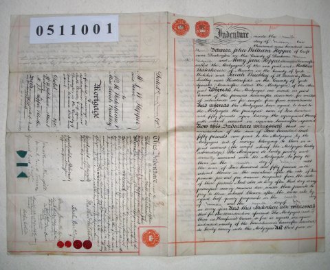 | Parchment : 2 sheets 40cm x 26cm with 2 weax seals, 2 signtures and revenue stamps. A second indenture of 1915 has been added on the back cover. | ||||||||||||