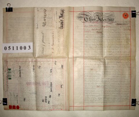 | Parchment : 2 sheets 48cm x 31cm with a second indenture of 1924 added at the end. Total of 6 wax seals, 6 signatures and revenue stamps. | ||||||||||||