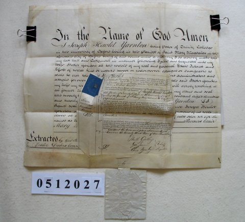 | Parchment : Copy of Will on 1 sheet 35cm x 40cm with separate grant of probate 18cm x 19cm and pendant seal | |||||||||||
