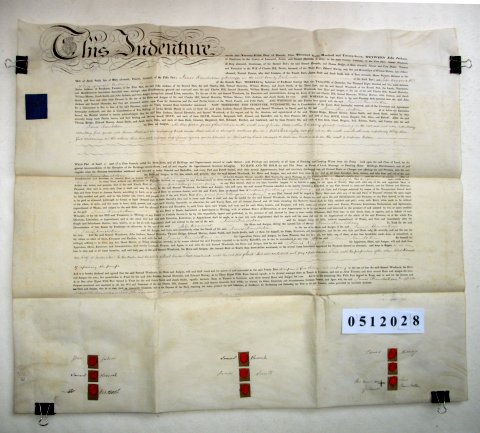 | Parchment : 1 sheet 68cm x 80cm with 9 wax seals, 7 signatures and revenue stamp. Printed document with manuscript insertions. | ||||||||||||
