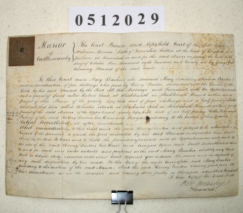 Mary BARKER of Castle Sowerby, Cumberland. Henry DENTON of Castle Sowerby, Cumberland. George Gell MOUNSEY Castle Sowerby, Cumberland. Steward of the Manor. SUBJECT This is a record of a Court Baron of the Manor of Castle Sowerby. It tells us that Mary Barker is surrendering copyhold land in the manor to the Lord of the Manor and that Henry Denton is then immediately admitted to it. The property conists of a messuage and parcel of land called Holme Head at Stocklewath. (It is not clear to me what is going on here. Henry Denton is only paying 5 shillings and Mary Barker retains the right to dispose of the property either by her will or otherwise). | |||||||||||