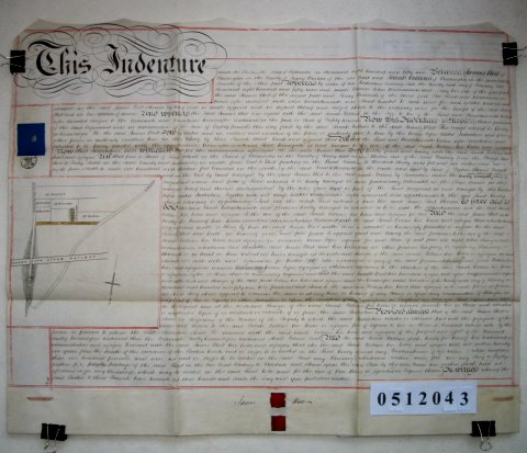| Parchment : 1 sheet 57cm x 71cm with 2 wax seals, 1 signature, revenue stamp and plan of the property | |||||||||||||