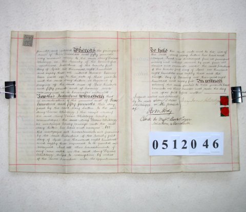 | Parchment : 2 sheets 22cm x 27cm with 2 wax seals, 2 signatures and revenue stamp | ||||||||||||